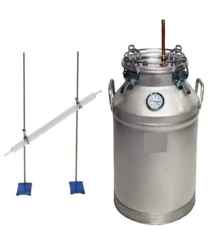 دستگاه تقطیر یا گلابگیر خانگی (عرقگیر/گلابگیر) 50 لیتری با شلنگ سیلیکون و کندانسور (خنک کننده) آبی شیشه ای پیرکس و ترمومتر (دماسنج)